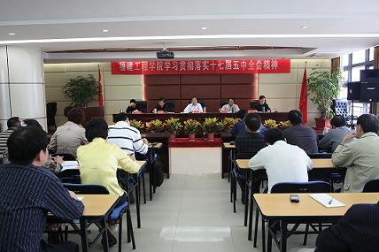 | 10月22日上午,我校召开党委扩大会议,学习贯彻十七届五中全会精神。校领导蒋新华、李永苍、张建勋、林国强、陈文哲,各党总支、直属支部书记,机关职能部门和直属单位主要负责人参加了会议。 蒋新华院长主持会议,并与参会者共同学习了十七届五中全会决议,重点传达了在20日上午召开的福建省委常委(扩大)会议上省委书记孙春兰关于学习贯彻党的十七届五中全会精神的重要讲话精神,和省长黄小晶关于制定福建省“十二五”规划的建议。 蒋新华院长就如何学习贯彻十七届五中全会精神提出五点初步意见:一是传达学习好、贯彻落实好五中全会精神。蒋校长强调,党的十七届五中全会是在我国即将完成“十一五”规划,全面建设小康社会进入关键时期召开的一次重要会议。学习贯彻全会精神是我校当前和今后一段时期内的重大政治任务,各单位要召开专题会议认真组织广大党员干部传达学习,准确把握全会精神主题,把思想和行动统一到中央重大决策部署上来。二是全力以赴做好学校当前主要工作。“十二五”时期是我校全面创建国内一流应用型本科院校的关键时期,要以贯彻落实五中全会精神为强大动力,统筹做好当前各方面工作,特别是要认真做好硕士学位授予单位立项建设、卓越工程师计划、教育质量工程建设、学习型党组织建设等主要工作。三是高度重视新形势下的群众工作。抓好本学期确定的办实事项目,认真制定绩效工资改革方案,确保教职工收入稳步增长,切实维护广大教职员工的切身利益。四是全力维护学校安全稳定。各级领导干部要高度重视,全面履行领导职责,严格执行值班带班制度,信息务必第一时间上报维稳办和分管领导,确保“信息灵、反应快、渠道畅”。五是立足岗位开展创先争优活动。各单位要结合学校本学期重大、重点工作,推动创先争优活动向纵深发展;要充分发挥典型示范作用,把好做法好经验宣传好、报道好,营造各级党组织和广大党员立足本职岗位创先争优的良好氛围。 李永苍副书记传达了上级有关维护安全稳定工作的文件精神,并对学校维稳工作进行进一步部署和安排。他强调,一要高度重视、提高认识,切实增强工作责任感,与党中央保持高度一致;二要加强排查、明确分工,认真细致地做好隐患整改,落实后勤保障工作;三要加强监管、掌握信息,及时了解师生的思想动态;四要深入一线、狠抓落实,加强安全稳定教育的针对性和实效性;五要明确责任、加强值班,发现问题及时上报,迅速处置。 (党办供稿,宣传部编辑) | | | | | |