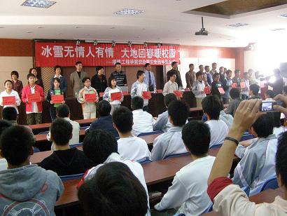 | 3月26日下午,以“冰雪无情人有情,大地回春暖校园”为主题的资助雪灾受困学生仪式在我校旗山校区隆重举行。校党委副书记李永苍、学工部负责人、各系总支副书记、新区辅导员、学生资助管理中心相关人员和受助学生代表共200多人参加了仪式。 同学们首先观看了一部《冰雪记忆》的短片,重温了那段全国一心抗击雪灾的难忘日子。学工部向同学们介绍了我校在春节期间对受灾地区学生给予的关怀以及采取的一系列帮困措施。 校党委副书记李永苍在会上做了重要讲话。他代表学校党政对受灾同学表示慰问,希望同学们能把这次雪灾经历化作人生中一笔宝贵的财富,在经历了这次灾害之后能够更加坦然地面对生活中的挫折和困难,进一步加深对国情的认识,以更加积极的心态投入学习;希望同学们要关注教育信息,充分利用社会和学校提供的平台,努力学习,拓展素质,早日成才。李副书记在讲话中强调,受助同学要学会感恩,以实际的行动回报社会,回报学校,传递爱心,共同构建我们温馨、团结友爱,互帮互助的校园。 本次资助共有126位同学受助,与会领导为受助学生代表发放了资助金。外语系商务英语0502班洪州同学代表受助同学发言,他回顾了自己在雪灾期间的经历及家乡抗击雪灾的见闻和感受,对学校领导和老师们给予遭受雪灾同学的关心和帮助表示由衷的感谢,并表示一定会努力学习,踏实实践,弘扬关爱精神,永怀感恩之心,努力回报学校、回报社会。 《光明日报》、《福建日报》、福建教育电视台等多家媒体对这次活动进行了采访。 (学工部供稿 党委宣传部编辑) | | | | | |