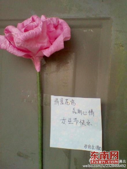 节日前,外语系女生部的男同学们通宵两个晚上亲手折出了1000多支粉色纸玫瑰,并在女生节这天凌晨偷偷别在每个女生的宿舍门前,附上写满祝福的便利贴,“愿女生们美好的一天有个美丽的心情”。