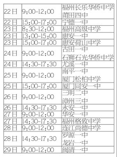 九所本科高校招生老师 今起走进全省各中学 日期:[2013年6月22日] 版次: A7 -- ·时政 -- 本报讯(记者郭盛齐榕实习生张婷婷)记者昨日从省教育厅获悉,省内本科高校联合发起“高校走进中学”高招咨询活动,高校招生老师与考生面对面交流。今日起,这些高校将走进省内部分中学展开招生咨询。 这9所省内高校为:福建师范大学、福建农林大学、福建医科大学、集美大学、福建工程学院、闽江学院、厦门理工学院、闽南师范大学(原漳州师范学院)、厦门大学嘉庚学院。 福建省内本科高校咨询活动日程安排表: