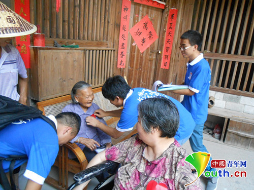 在村委会张仰太支委的带领下,实践团先后拜访了23位空巢老人。与老人们交流之后,队员们将精心准备的袜子和洗衣粉等生活用品赠与老人,同时在其胸前贴上红心。随后,队员们和老人们一起唱红歌、并为他们表演了节目和清扫了院子,老人们对于实践团的到来显得十分开心。与此同时,队员们还向村委和当地村民了解了土楼旅游发展的模式与过程并探讨了旅游业的开发给当地居民带来的利弊,让队员们对土楼旅游业的发展有了全新的认识和理解。