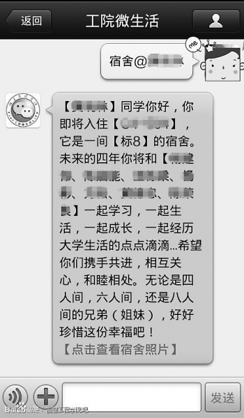 反响最大最好的是在这个月初新生入学时,他们推出“找舍友”的功能,新生们只要输入宿舍号和名字就可以查到自己所在的宿舍和即将共处的舍友。因为新鲜又方便,在这个功能推出的第一天,微信账号上就增加了1000多个新粉丝,短短三天内该功能总点击量达到近7000次。