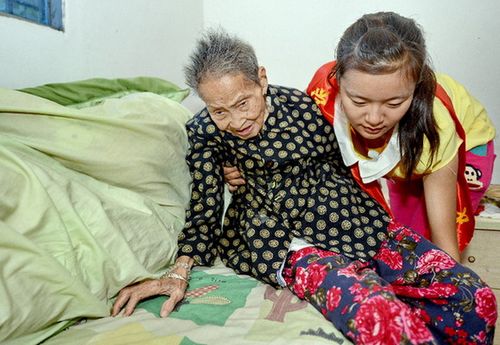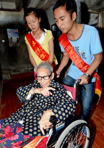 10月13日,福建工程学院土木工程学院大一学生刘嘉慧在福州清逸托老院帮助100岁的郭玉兰老人上床休息。