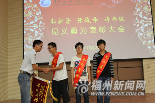 福州新闻网讯 在危急关头拉一把,救了落水父子2条命。16日,本报报道了福州工程学院3名大一新生救人不留名一事。21日,福建工程学院表彰救人者,授予许伟坡、张俊峰和郭新贤“福建工程学院见义勇为优秀大学生”荣誉称号,并给每人颁发3000元奖金。