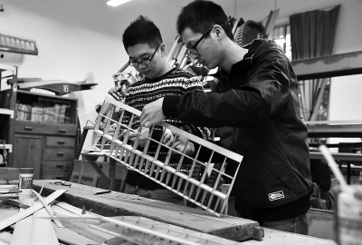 不仅进行飞行操控训练,目前,15名会员都在着手制作航模。“先用电脑绘制出各个飞机模型的零部件细节图,通过激光切割机打造出立体的零部件实物,然后把这些零部件进行拼接,做好构架后,根据自己喜欢的颜色、图案,用贴板给飞机做一件漂亮的外衣。”协会会员王勐一边动手,一边介绍了航模制作的完整过程。