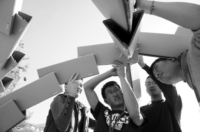 仅以瓦楞纸为原材料,居然建造出一座座美轮美奂的建筑。昨日,2013年首届海峡两岸建筑艺术节暨福建工程学院24小时建造大赛,在福建工程学院北区逸夫楼前举办。来自该校的14支学生队伍,共140多人参加了本次活动。