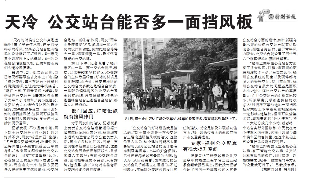 《福建日报》2013.12.23:天冷 公交站台能否多一面挡风板