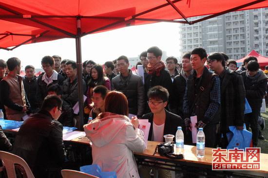 东南网12月21日讯(本网记者 谢添实)今日上午,福建省2014年住房城乡建设行业毕业生专场招聘会在福建工程学院举行,近500家用人单位提供了9652个工作岗位。在招聘现场,建筑施工企业受到毕业生的青睐,一些国有建筑单位前排起了长龙。