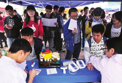 跟有些忐忑的初次献血者相比,蔡顺峰显得十分淡定,因为他此前已经在校内参加过2次献血,每次都是400毫升。