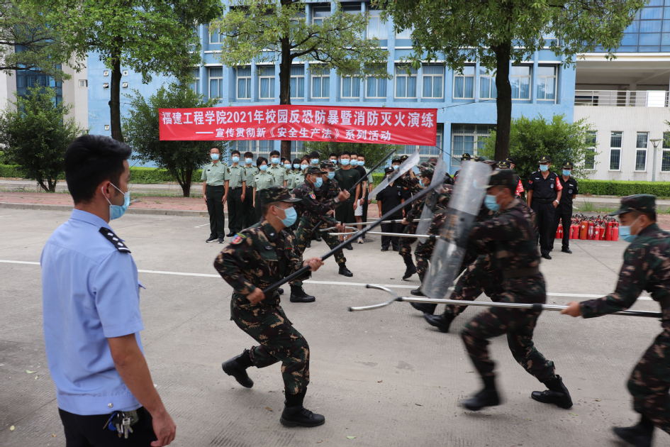 为了深入学习宣传贯彻新《安全生产法》,进一步提高师生遵规守法和安全防范意识,增强应急处置能力和避险自护技能,10月6日下午,学校在旗山校区联合开展2021年秋季学期校园反恐防暴暨消防灭火演练。宣传部、学工部、武保部、教师工作部、后勤处、设备处等部门负责人,2020年以来新入职辅导员、实验员(安全员)、安保人员、学生校卫队和退役大学生等130余人参加演练活动,辖区荷塘派出所民警应邀到场指导。