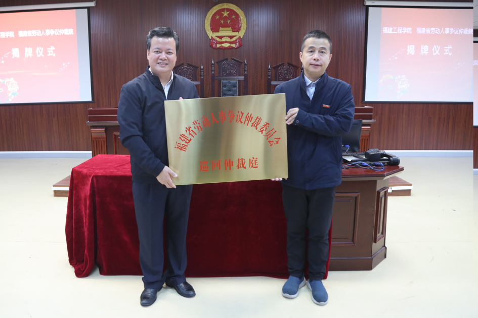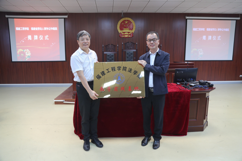 随后,法学院院长梁开斌与福建省劳动人事争议仲裁院院长王智榕签署了《福建工程学院—福建省劳动人事争议仲裁院共建实践教学基地协议书》。童昕校长、洪长春副厅长为“福建工程学院法学院教学实践基地”“福建省劳动人事争议仲裁委员会巡回仲裁庭”揭牌。