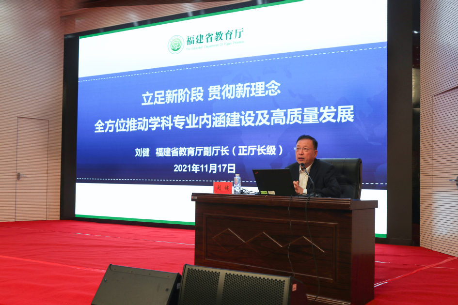 刘健副厅长作题为《立足新阶段 贯彻新理念 全方位推动学科专业内涵建设及高质量发展》的主旨报告。他深入分析了当前我省高等教育的形势和任务,对“十四五”规划以及十年规划的目标任务、战略举措进行了全面的解读。他指出,要以深入学习贯彻党的十九届六中全会精神为契机,深刻领会、准确把握习近平总书记关于高等教育的重要讲话重要指示批示精神,大力传承弘扬习近平总书记在福建工作期间的重要理念和重大实践,牢记党中央、国务院赋予福建新的历史使命,全面把握福建高等教育面临的新形势新任务,从百年党史中汲取智慧和力量,把党的百年奋斗重大成就和历史经验转化为推动高质量发展的动力,全方位推进福建省高等教育高质量发展超越。