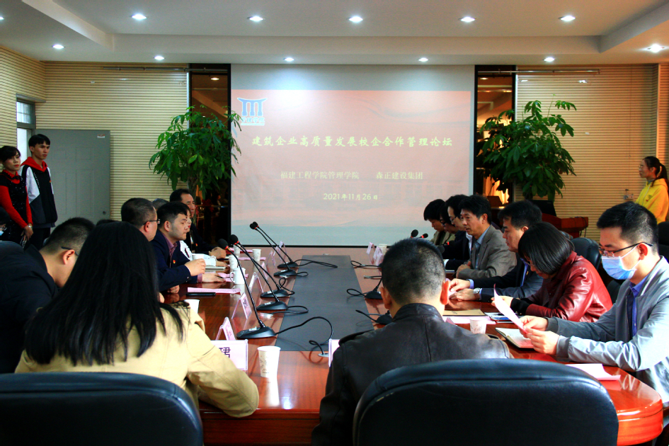 随后,双方举行了建筑企业高质量发展校企合作管理论坛。森正建设集团董事长张东鹏在致辞中,介绍公司发展现状以及在工程施工、管理上遇到亟需解决的课题。在主题报告环节,福州大学吴应雄教授、管理学院陈云川副教授和刘林副教授分解结合土木工程校企合作的规划与实施、建设单位应对工程造价改革的具体策略、建筑企业信用分的规划及管控等议题作了主题报告。在交流研讨环节,与会人员结合建筑企业高质量发展、校企合作等问题进行了深入讨论,达成了进一步合作的意向思路。