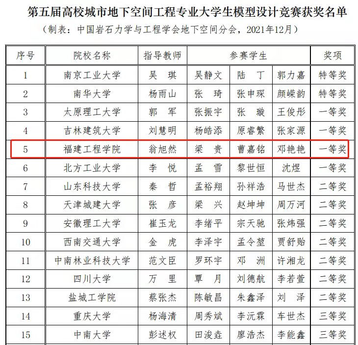 12月20日,由中国岩石力学与工程学会、教育部高等学校土木工程专业教学指导分委员会共同主办,西南交通大学承办的第五届高校城市地下空间工程专业大学生模型设计竞赛落下帷幕,我校选送的“必须拿下”队(学生:2019级城市地下空间专业梁贵、曹家铭、邓艳艳;指导老师:翁旭然)荣获全国一等奖,取得该项赛事的新突破。