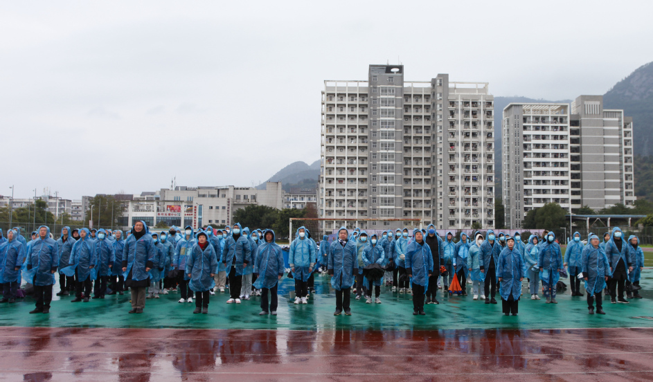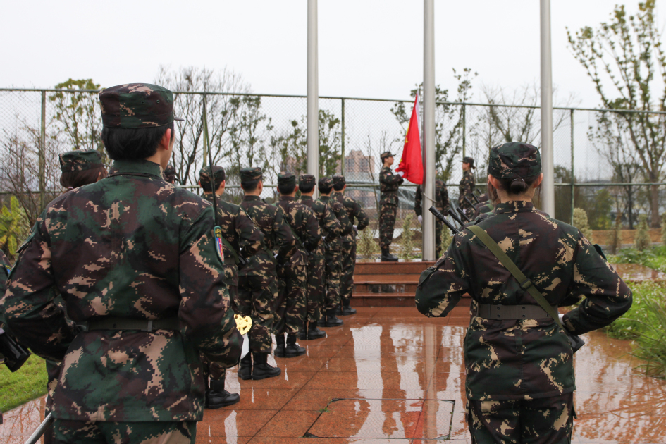 国旗护卫队迈着整齐划一、铿锵有力的步伐,迎着细雨,昂首阔步护卫着国旗走向升旗台。8时许,升旗仪式正式开始,伴随着雄壮的《义勇军进行曲》,五星红旗冉冉升起。全场师生庄严肃立,面向五星红旗行注目礼,齐声高唱国歌,深情表达对祖国的无限热爱和崇高敬意。