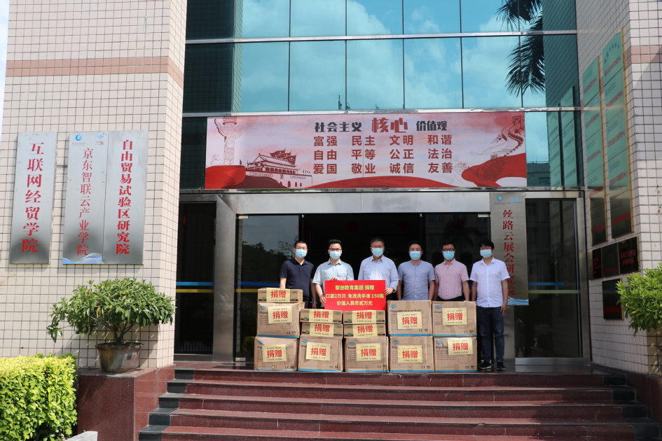 4月15日上午,聚创教育集团向学校捐赠一批防疫物资。副校长韦建刚代表学校接受了捐赠,互联网经贸学院党政班子成员参加捐赠仪式。