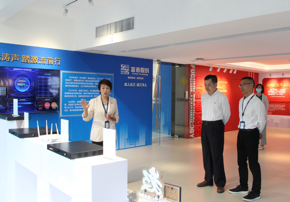 调研中,富春科技股份有限公司董事长缪品章,校友、富春股份总裁陈苹对吴书记一行的到来表示热烈欢迎,并详细介绍了富春股份在电子政务、文化消费等领域的发展情况,分享了富春股份“成人达己、成己为人”的企业党建工作特色,期待与学校在人才培养、实习实践、产学研等方面加强合作。