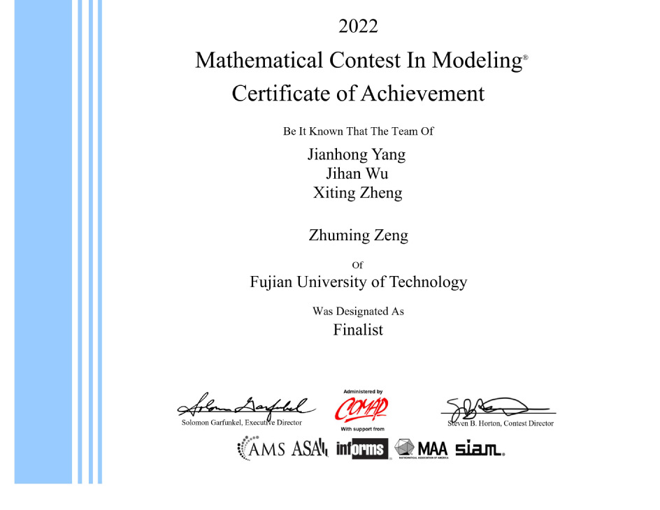 近日,2022年美国大学生数学建模竞赛成绩正式公布。我校电气工程及其自动化1901学生杨鉴鸿、郑熙庭和建筑电气与智能化1902吴际涵三人在计算机科学与数学学院曾祝明老师的指导下,从全球27000多支参赛队伍、80000多名参赛者中脱颖而出,荣获Finalist Winners奖(特等提名奖),这是我校师生继2021年首次获得Finalist Winners奖后又一次获此殊荣。我校是除厦门大学外,省内唯一一所连续两年荣获Finalist Winners奖的高校。此外,我校师生还荣获大赛一等奖(Meritorious奖)1项、二等奖(Honorable奖)3项,创造了学校参赛以来最好的成绩。