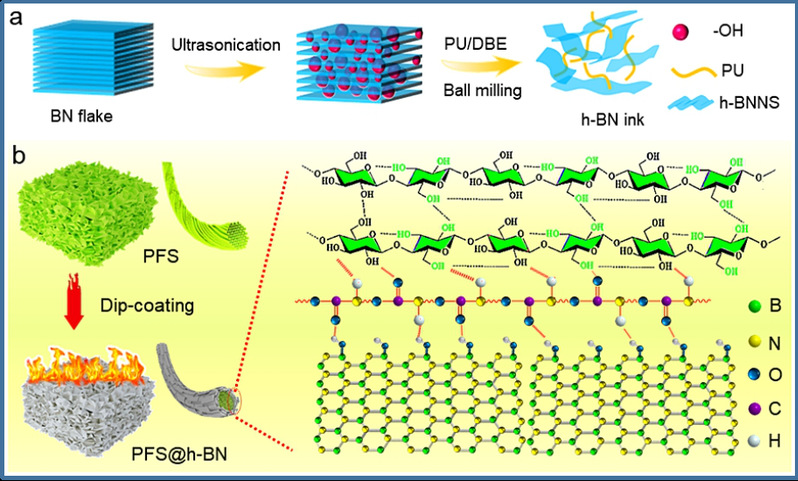 图2 h-BN油墨制备防火阻燃PFS@h-BN的流程示意图