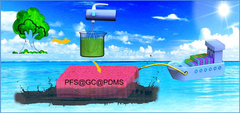 在Journal of Hazardous Materials上发表的论文《Solar-assisted high-efficient cleanup of viscous crude oil spill using an ink-modified plant fiber sponge》(论文链接:https://doi.org/10.1016/j.jhazmat.2022.128740)采用油墨改性制备了一种具有可压缩回弹和光热效应特性的疏水亲油PFS@GC@PDMS多孔植物纤维海绵。与微型隔膜泵相连的PFS@GC@PDMS多孔海绵材料,在太阳能光热作用下能够显著降低原油的粘度,从而促进材料对原油的吸附,其吸附速率比无光照条件下提升了25倍,可实现对油水混合液中油污的持续吸附和高效回收,有望应用于海上泄漏石油的高效清理(图1)。