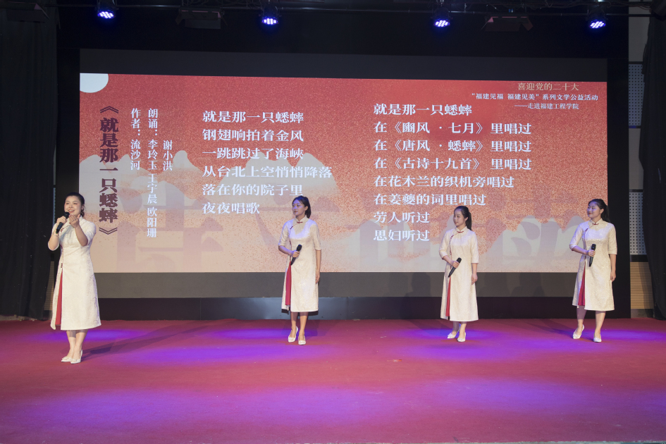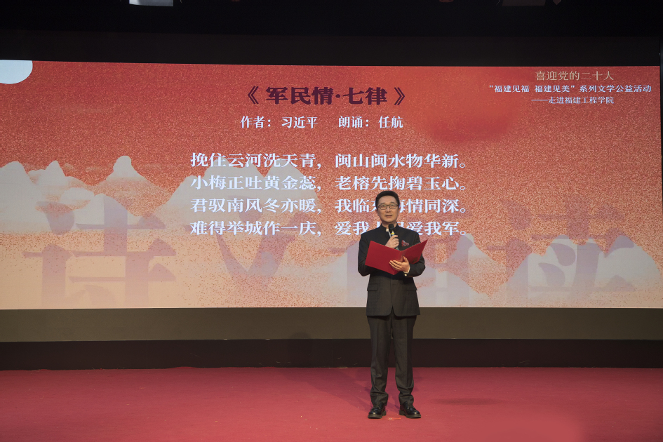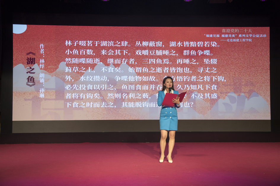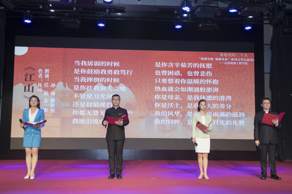来自福建省广播影视集团等单位的朗诵小分队成员以及校大学生艺术发展中心“声动苍霞”诵读艺术团的团员们深情朗诵了《念奴娇·追思焦裕禄》《军民情·七律》《青春中国》《以青春之我,述百年风华》《湖之鱼》《福见·游子》《就是那一只蟋蟀》《江山》等文学作品。在场师生表示,要从书中汲取前行的力量,承历代名贤之志,育莘莘学子之识,与时代发展同步,和民族命运相连。