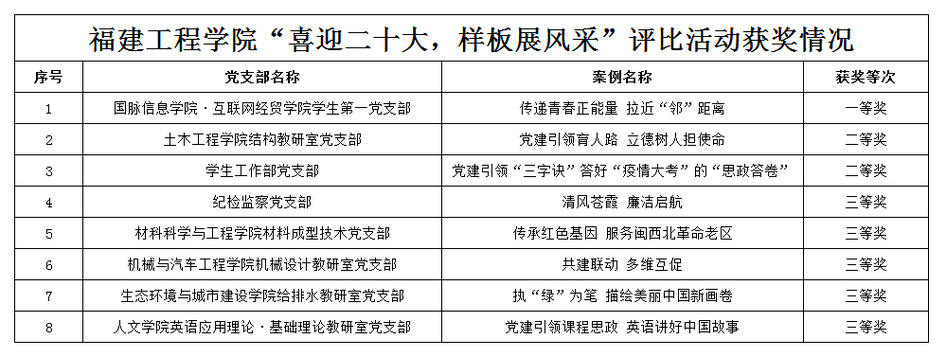 参加现场展演的8个样板支部紧紧围绕“七个有力”,聚焦党建工作与业务工作融合发展,结合学科专业、疫情防控、志愿服务和思想政治教育等方面工作,有效彰显学校在新时代党的基层组织建设的优秀成果,充分展示了广大党员的精神风貌。经过评审,最终评选出一等奖1项、二等奖2项、三等奖5项。莅临现场的领导和评委为获奖党支部颁发了荣誉证书。