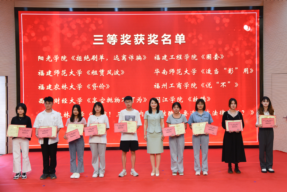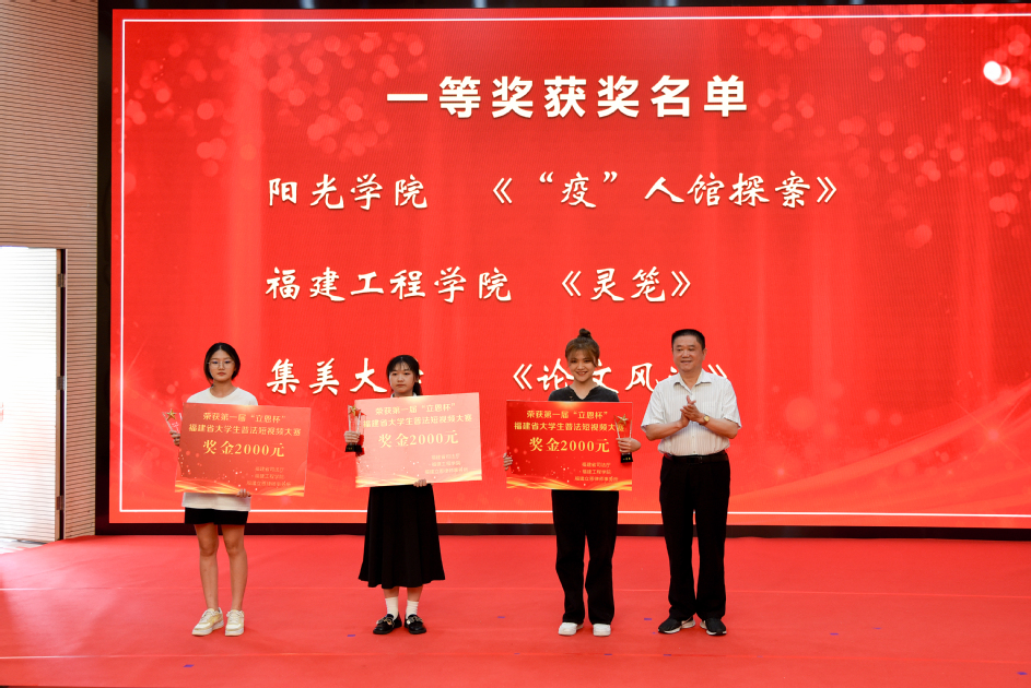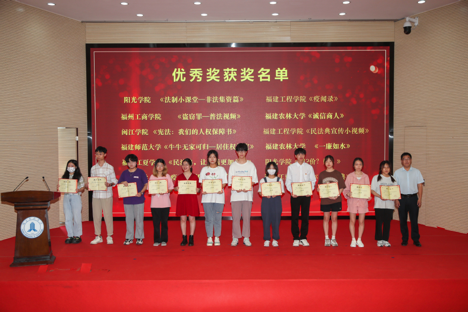 6月23日下午,由福建省司法厅主办、福建工程学院承办、福建立恩律师事务所协办的第一届“立恩杯”福建省大学生普法短视频大赛颁奖仪式在我校学术报告厅举行。省司法厅副厅长林德明、校党委副书记詹松青,省司法厅普法与依法治理处、福建立恩律师事务所及学校相关单位负责人,各高校参赛选手代表参加了此次活动。
