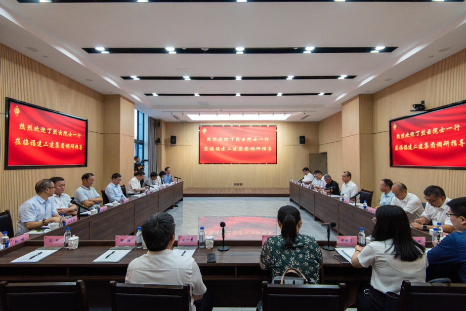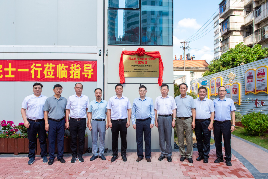 当天下午,丁烈云院士一行来到课题合作单位——福建省二建建设集团有限公司调研指导,并为中国工程院智能建造课题示范项目——中国华电福建总部大楼项目揭牌。中国工程院院士丁烈云,福建工程学院党委书记吴仁华,福州城投集团党委书记、董事长黄志强,福建省二建集团党委书记、董事长刘晓光等共同为示范项目揭牌。随后,丁烈云院士一行实地考察了中国华电福建总部大楼项目现场,并就基于“工程云”的项目智能管控平台建设提出指导意见。