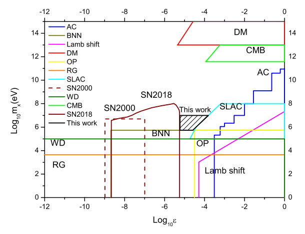 宇宙中可能存在着微量带电粒子,其携带的电荷远小于电子电荷。此种粒子可能是暗物质的候选者之一,但与其他暗物质候选者不同,它是带电的,而非中性粒子。该论文研究了IceCube探测来自太阳高能微量带电粒子的可能性。此种粒子是由被太阳俘获的重暗物质粒子衰变而来。该研究引入一个镜像规范群U(1),其相应无质量暗光子与普通光子相混合,从而使微量带电粒子与核子存在着微小的电磁相互作用。研究运用该模型计算微量带电粒子与核子的相互作用截面,利用IceCube的6年实验数据寻找微量带电粒子,并估算了IceCube探测此种粒子的能力,即在TeV能标下,混合参数约大于10-10以及重暗物质寿命小于1021秒范围内,IceCube可以探测到来自太阳的微量带电粒子,并给出了一个新的参数空间排除区域(见图中阴影部分)。(科研处供稿)