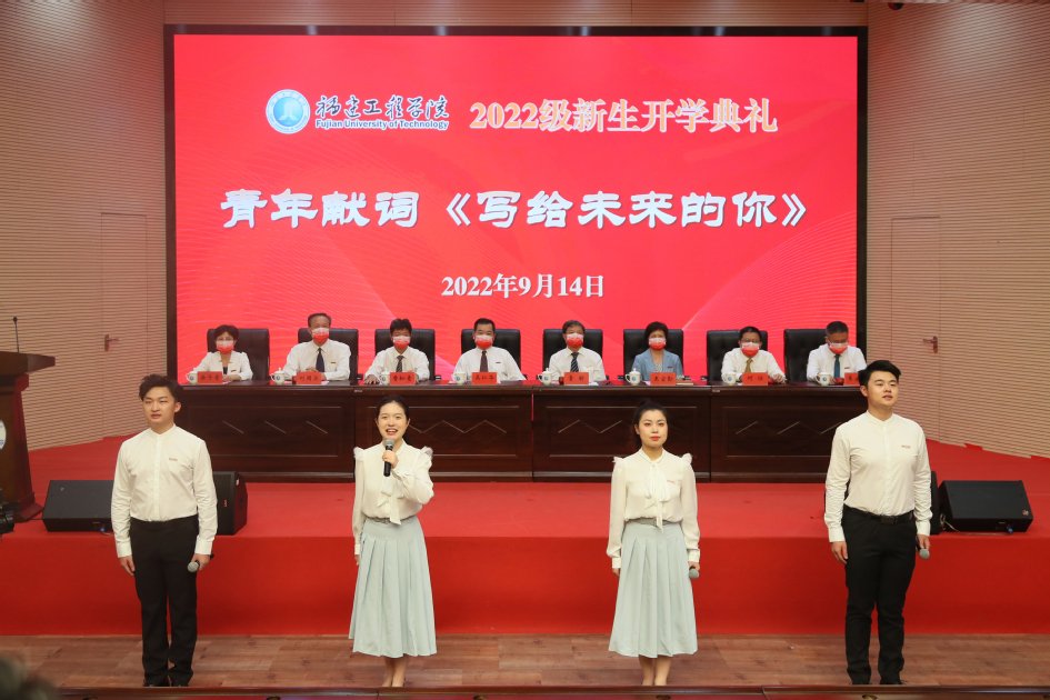 典礼上,大学生艺术发展中心“声动苍霞”诵读艺术团带来朗诵《写给未来的你》,并举行了校徽佩戴仪式。