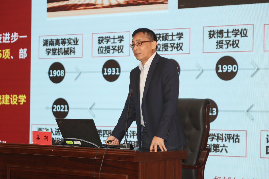 10月11日上午,学校邀请湖南大学党委常委,机械与运载工程学院执行院长、博士生导师姜潮教授到校开展中层干部第三专题培训讲座。校领导、全校中层干部及师生代表200余人通过线下线上相结合的方式参会。讲座由校长童昕主持。