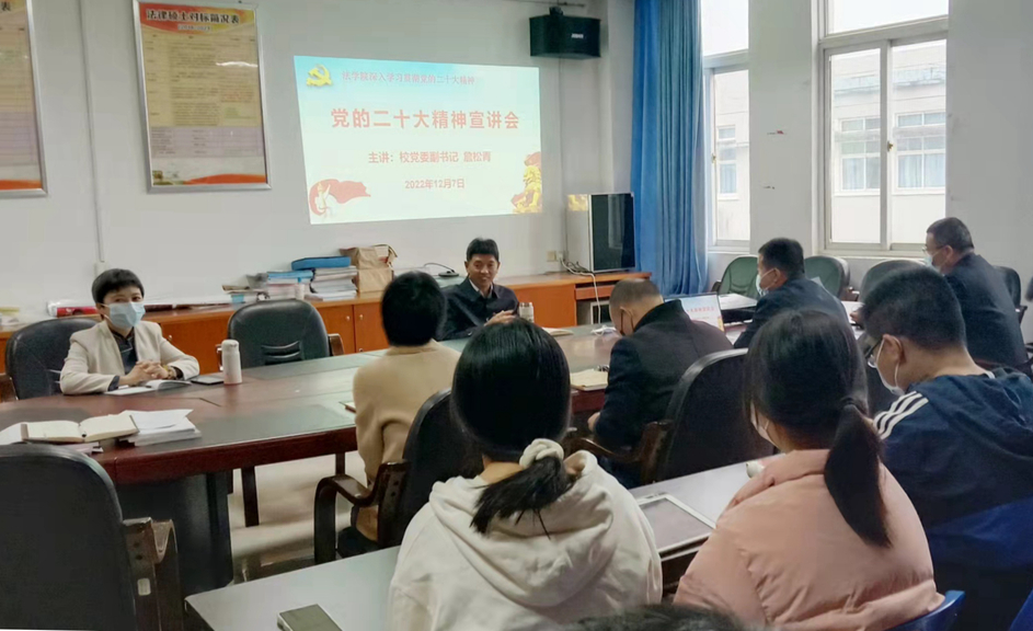 12月7日下午,校党委副书记詹松青为法学院师生作了题为“以高质量发展为中国式现代化添砖加瓦”的主题宣讲。法学院党委委员、科级以上干部、党支部书记、辅导员和师生党员代表聆听宣讲报告。
