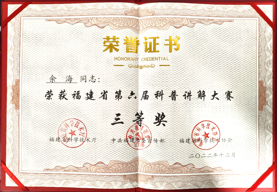 近日,由福建省科学技术厅、中共福建省委宣传部、福建省科学技术协会共同主办的福建省第六届科普讲解大赛获奖名单公布。经二级学院选拔、学校初评和省赛评审,我校生态环境与城市建设学院余海老师荣获三等奖。