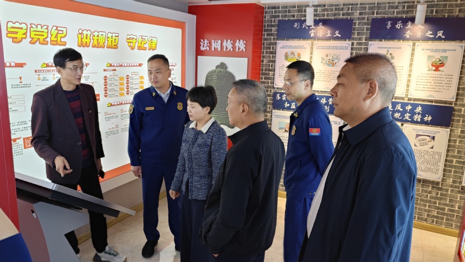 徐子青一行参观了大队营区训练设施、党建馆、消防科普教育馆等处,听取了消防大队开展消防安全教育有关情况的介绍。她在调研中指出,学校要以“消防安全进校园”等活动为载体,进一步加强对师生的安全教育,提高消防安全素质,增强应急处置和自救互救能力,为校园稳定和消防救援建设提供保障。