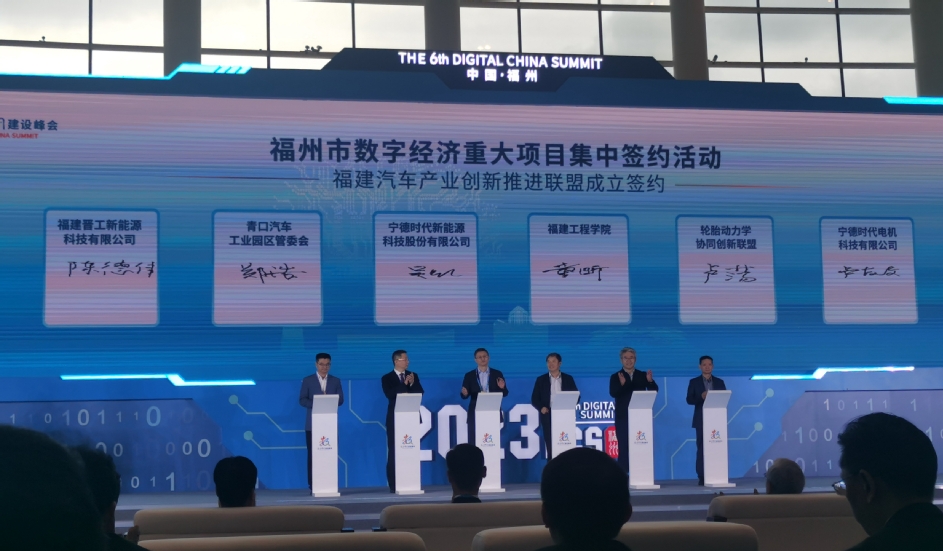 4月26日下午,第六届数字中国建设峰会福州市数字经济重大项目集中签约活动在福州海峡国际会展中心举行,现场共签约战略合作框架协议6项、重大项目25项。由著名汽车设计研究专家、中国工程院院士、我校特聘教授郭孔辉作为发起人,我校担任理事长与秘书处单位的福建汽车产业创新推进联盟签约成立。校长童昕代表学校与宁德时代新能源科技股份有限公司、轮胎动力学协同创新联盟、青口汽车工业园区管委会、宁德时代电机科技有限公司、福建晋工新能源科技有限公司签订了六方协议。