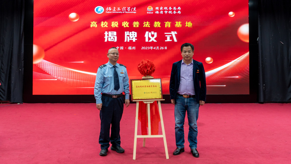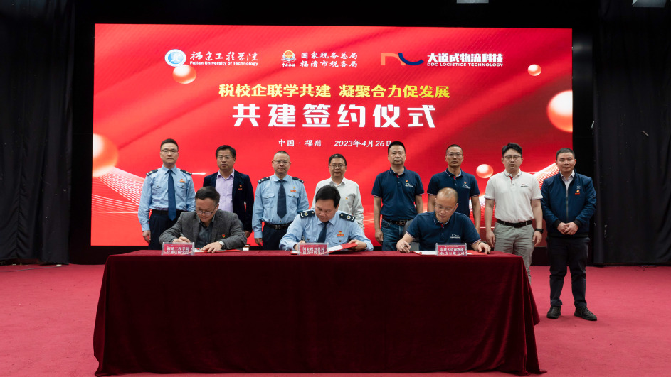 仪式上,交通运输学院与国家税务总局福清市税务局、福建大道成物流科技有限公司签署了共建合作协议。交通运输学院与国家税务总局福清市税务局揭牌成立了福建省首个“高校税收普法教育基地”,并将与福建大道成物流科技有限公司共建“研究生联合培养基地”。
