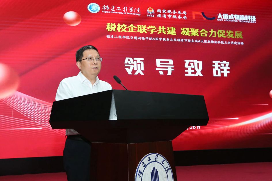 4月26日下午,福建工程学院与国家税务总局福清市税务局、福建大道成物流科技有限公司开展“税校企联学共建 凝聚合力促发展”三方共建活动。副校长何仕出席活动并致辞,国家税务总局福清市税务局党委书记、局长江清友,福建大道成物流科技有限公司董事长林顺钦以及交通运输学院师生等税校企三方代表近200人参加活动。