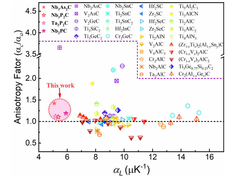 图2:As/P基MAX相与其他MAX相的报告值的平均热膨胀系数和各向异性比较,红色圆圈标记了本工作中报告的数据