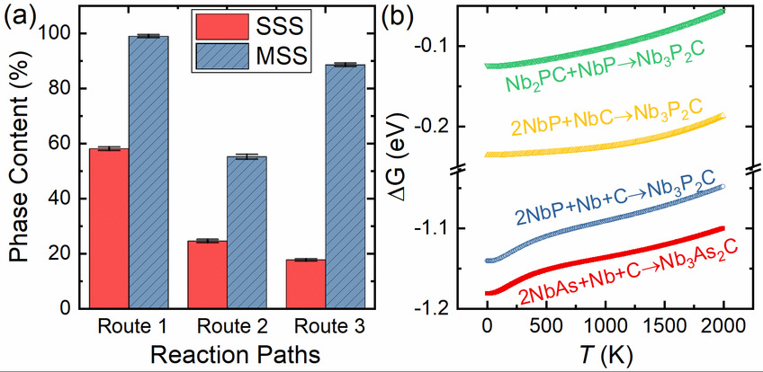 图1:(a)固相法和熔盐法通过不同的化学反应途径制备的样品的相相含量对比图;(b)计算了合成Nb3P2C的不同化学反应过程中的吉布斯自由能变化