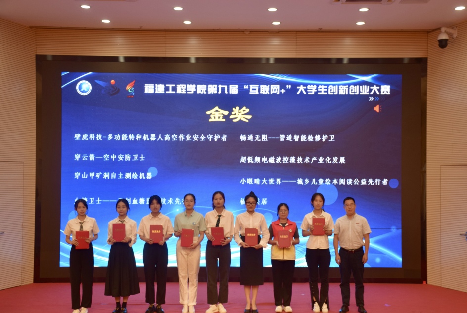 经学生报名、学院推荐、学校网评等环节,31个优秀项目从2200多个项目中脱颖而出,入围金奖争夺赛。入围项目经路演展示、评委提问等环节的激烈角逐,最终计算机科学与数学学院《壁虎科技-多功能特种机器人高空作业安全守护者》、机械与汽车工程学院《穿云箭—空中安防卫士》《穿山甲矿洞自主测绘机器》、材料科学与工程学院《血糖卫士——无创血糖监测技术先行者》、交通运输学院《畅通无阻---管道智能检修护卫》、应用技术学院《超低频电磁波控藻技术产业化发展》等6个项目获高教主赛道金奖;管理学院《小眼睛大世界—乡村儿童绘本阅读公益先行者》,土木工程学院《福工美居——乡村自建房质量安全的守护者》等2个项目获得“青年红色筑梦之旅”赛道金奖。现场举行了颁奖仪式,与会嘉宾为8个金奖项目、17个银奖项目和25个铜奖项目颁发荣誉证书。