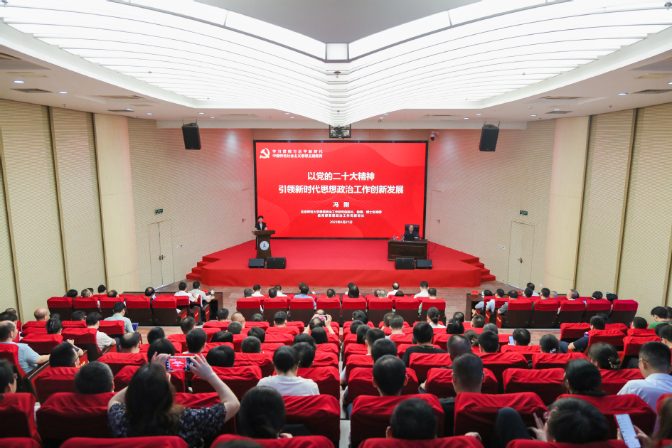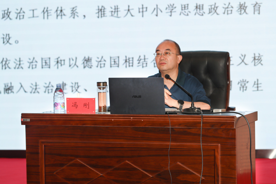为深入开展学习贯彻习近平新时代中国特色社会主义思想主题教育,加强和改进新形势下学校思想政治工作,6月21日上午,北京师范大学思想政治工作研究院院长、博士生导师,教育部思想政治工作司原司长冯刚教授应邀来校作专题报告。校领导、全体中层干部、党支部书记代表、马克思主义学院教师和各学院学生代表近200人聆听了报告。