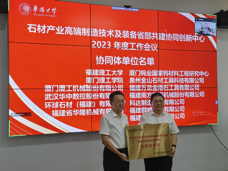 会上,我国石材制造领域的专家、学者分别作了专题报告。来自多所高校院所和有关企业的参会代表围绕协同创新中心建设情况、未来发展趋势前景等专题进行了深入交流,分享了近年来在石材加工领域取得的有关研究成果。期间,协同创新中心主任、华侨大学党委书记徐西鹏向我校颁发的协同体单位牌匾。