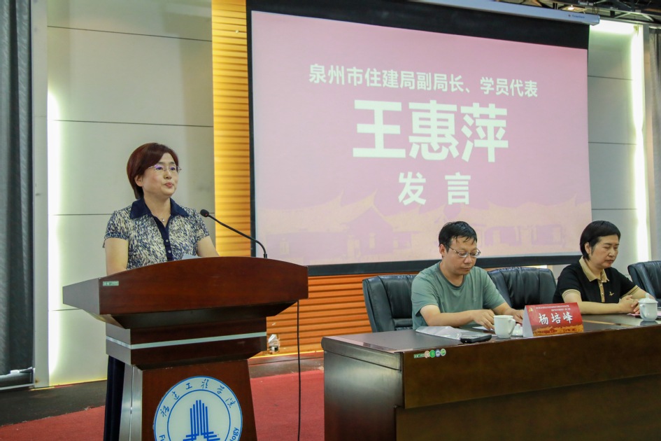 泉州市住建局副局长王惠萍作为学员代表发言,介绍了泉州市历史文化保护传承利用开展的工作和取得的成绩。她表示,作为一名历史文化保护传承工作者,深感使命光荣、责任重大,要倍加珍惜此次培训机会,端正态度,专心学习、服从安排,遵守纪律、学以致用,学用结合,将学到的知识运用到教学实践中,切实提升工作能力和水平,不断推动历史文化保护传承利用工作上新水平。