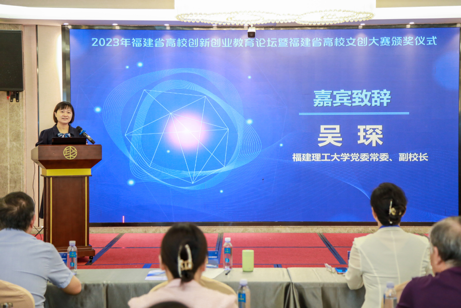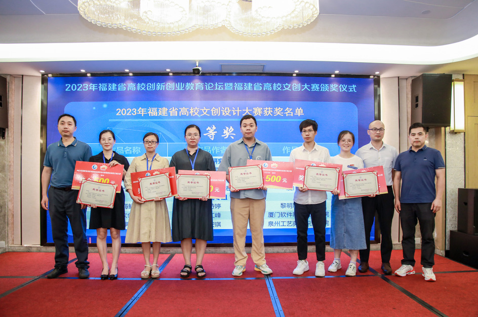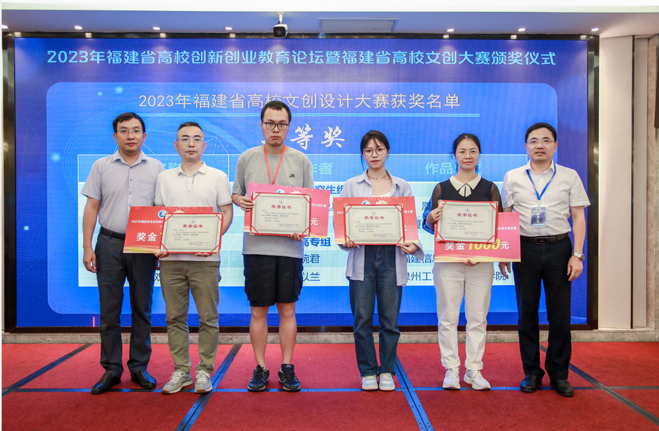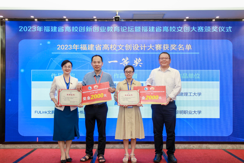 在福建省高校文创设计大赛颁奖仪式上,参会领导和嘉宾为获奖项目代表、优秀组织奖代表颁奖。本次大赛共征集到276件参赛作品,经过参赛单位推荐和专家评委评审,按照本科生、研究生组以及高职高专组分别评选出一等奖1名、二等奖2名、三等奖3名、优秀奖15名以及优秀指导教师奖1名。此外,还评选出16个荣获优秀组织奖的单位。