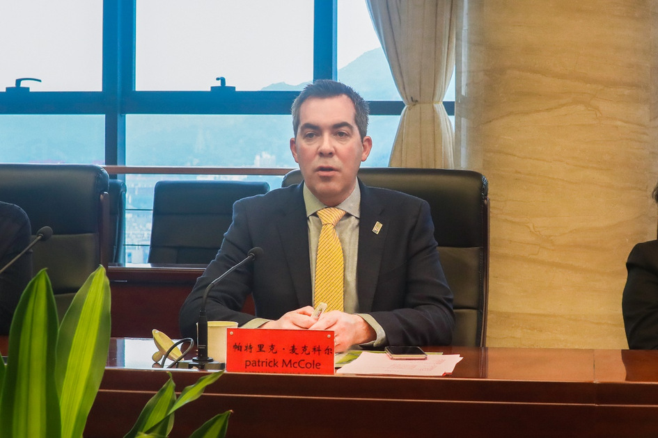 童昕对帕特里克·麦克科尔一行的到访表示热烈欢迎,重点围绕学科建设、科学研究以及国际化办学等方面介绍了我校的历史沿革和近年来发展成果,并指出两校的学科建设发展方向相同、合作空间广阔,希望双方进一步深化合作交流、携手共谋发展。