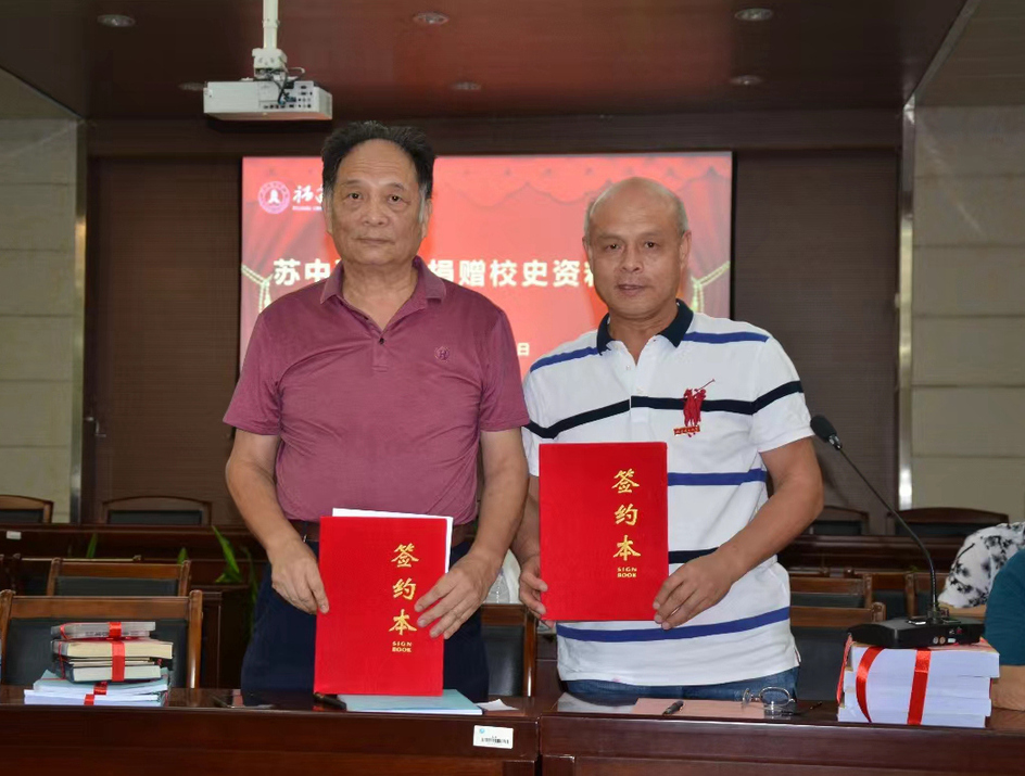 会上,苏中强介绍了捐赠的校史资料,展示了他所编写、收集的校史文稿及有关资料。随后,郑旺材与苏中强签署了捐赠协议,并为其颁发了捐赠证书。