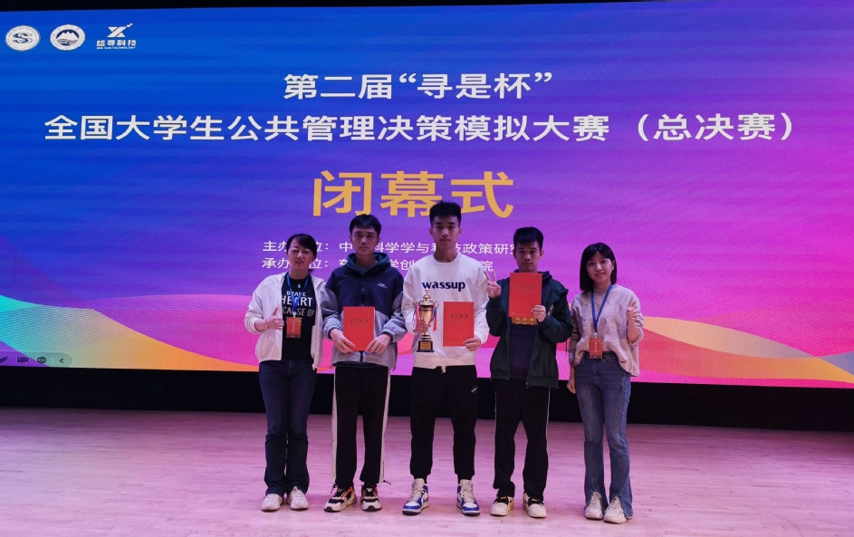 10月29日,第二届“寻是杯”全国大学生公共管理决策模拟大赛总决赛在东北大学落下帷幕。我校管理学院公共事业管理专业学生团队“城市之光”代表队(学生:韦天宇、蔡伟杰、林晓锐,指导教师:戴雯、郑怀瑾),与来自北京大学、武汉大学、电子科技大学、中央财经大学、厦门大学等高校的71支代表队伍同台竞技,最终荣获全国二等奖的好成绩。