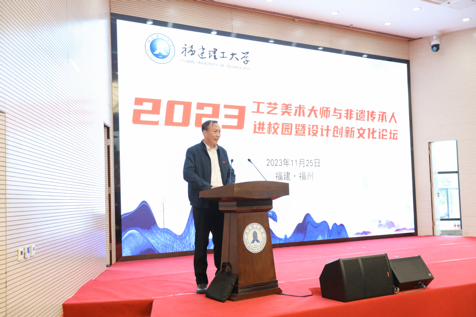 11月25日,福建理工大学2023年工艺美术大师与非遗传承人进校园暨设计创新文化论坛在旗山校区举行,论坛以“连通传统技艺与当代设计、赓续传统文化脉络、助推非遗文化传承创新发展”为主题。校党委书记吴仁华、校长童昕、校纪委书记(监察专员)王宜勤、副校长刘国买,福建省闽台文化交流中心主任郑金龙,福建省文化和旅游厅非物质文化遗产处四级调研员郭淑贞,冰心文学馆馆长、福建省海峡民间艺术馆馆长黄文明,福建省美术家协会副主席、福州市美术馆馆长郭辉,福建省雕刻艺术家协会会长陈文荣,福建省雕刻艺术家协会党支部书记、福建省非物质文化遗产代表性传承人黄建强,福建省雕刻艺术家协会副会长、陶瓷专业委员会主任李甲栈,福建省雕刻艺术家协会驻会秘书长陈建辉以及53位工艺美术大师与非遗传承人、学校有关职能部门负责人、设计学院相关负责人、师生代表等200多人参加活动。活动由副校长刘国买主持。