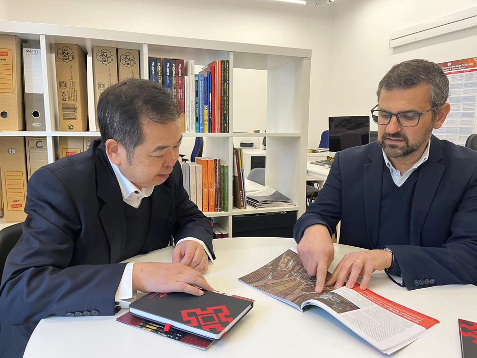 11月18日,代表团一行来到埃武拉大学,受到副校长保罗·夸雷斯马、HERCULES文化遗产材料分析实验室原主任安东尼奥·坎德亚斯教授的热情接待。夸雷斯马对吴仁华一行的到访表示欢迎,并听取了吴仁华关于福建理工大学、建筑与城乡规划学院及中葡文化遗产保护科学联合实验室福州基地的建设发展情况介绍。他表示,埃武拉大学愿与福建理工大学深化合作,在建筑与文化遗产保护领域联合培养人才。吴仁华对夸雷斯马和坎德亚斯的热情接待表示感谢。他指出,中国-葡萄牙文化遗产保护科学“一带一路”联合实验室福州研究基地于去年4月落地福建理工大学,开启了两校合作的篇章。随后坎德亚斯教授一行于今年4月来校交流,双方签署合作备忘录,有效推动了两校在文化遗产保护、遗产科学发展与人才培养领域的深入合作。他希望以本次到访为契机,进一步推动两校在历史建筑保护等学科的人才联合培养项目落地,为中国乃至世界文化遗产保护事业培养国际化人才。双方签署了硕士生联合培养学分互认协议,表示将进一步发挥两校在学科建设与发展方面的一致性和良好的合作基础,持续推进沟通与协同机制,在师生交流、学科建设、科研合作等领域建构中长期协同发展机制。访问期间,吴仁华一行在坎德亚斯教授的陪同下,实地参观了HERCULES文化遗产材料分析实验室、人文图书馆、艺术学院等场所,调研了学校教学空间和活动平台,并看望慰问了学校派驻联合实验室海外研究基地的陈舒洁老师。