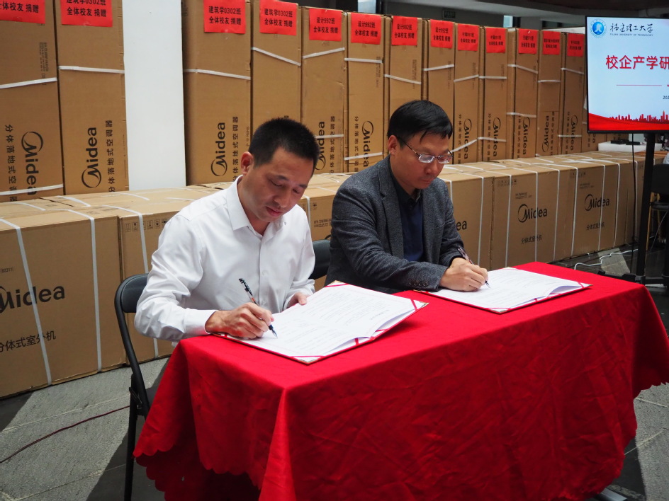 建筑与城乡规划学院校友分会常务副会长陈弼成代表校友向学院捐赠30台空调用于专用教室的学习环境改善,并在发言中表达了广大校友心系母校、积极为学院教学环境改善添砖加瓦的学子情怀。副校长何仕、校友会会长郑旺材、校友会副会长林从华为校友代表颁发捐赠证书。校友企业经纬联合(福建)工程技术集团有限公司与学校签订了产学研合作协议。
